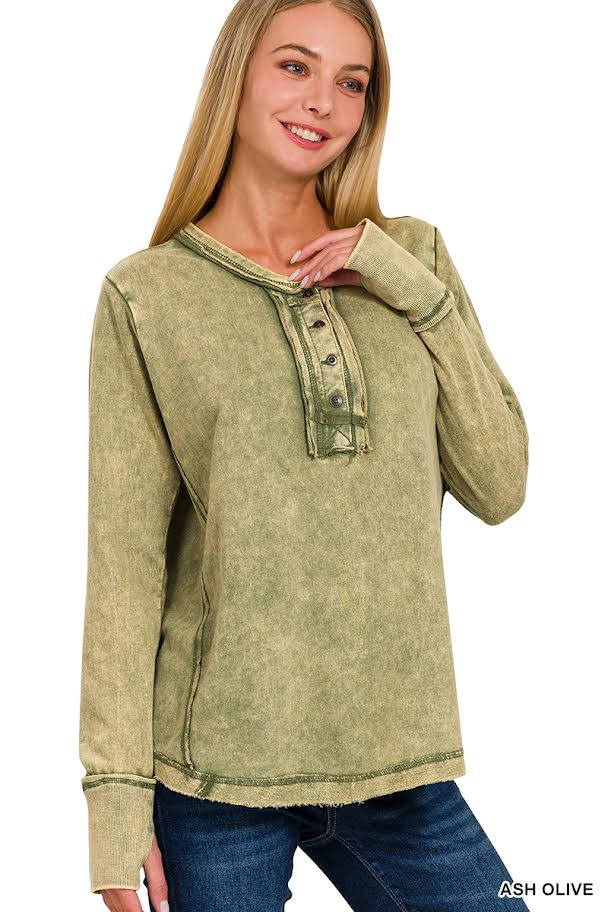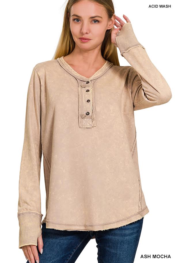 This washed long sleeve top blends comfort with edgy style, featuring thumb hole cuffs, raw edge details, and a scoop neckline. The front button closure and back patch design add extra flair. Made from 100% cotton for a soft, breathable feel.